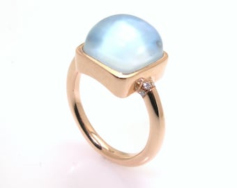 A gold ring with a large, round, blue gemstone in the center, surrounded by a halo of smaller diamonds, set on a white background. | Blue Topaz / Mother of pearl Ring. | c79d2942b29cfc1b031deaa0c901827cf4f232cd10854dfb8e3277d4361bbff0 | 000000023151 | 0 | 0 | 24 | 7 | 0 | 0 | |