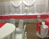 A wedding reception setup with a long red and white tablecloth covering a table. The table is adorned with white chairs on either side, and a red bow is tied to the back of one of the chairs. The floor is carpeted, and there is a white wedding arch with white drapes in the background. A white vase with a small white flower is placed on the table. | Custom Made Coral Rosette Skirting Band for 16 ft Head Table | d14035eb6e996ee91150b6676b668e8d6381f84b29ae6260f56d51e4107b6b2e | 000000023208 | 0 | 0 | 68 | 11 | 0 | 0 | |