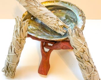 A traditional clay pot with a textured surface and a wooden handle is placed on a red stand. The pot is adorned with a decorative blue and gold pattern. Surrounding the pot are several bundles of dried herbs tied with twine, creating a rustic and earthy display. | Smudge Kit - Premium Abalone shell, Wood Cobra Stand, 3 California White Sage Smudge Sticks - Smudging, House Cleansing, Negativity Clearing | b6534e8e17194d8a2d24b81a44f4d29c400a1addf68ad58216e5e485c43f756f | 000000023204 | 0 | 0 | 47 | 21 | 0 | 0 | |