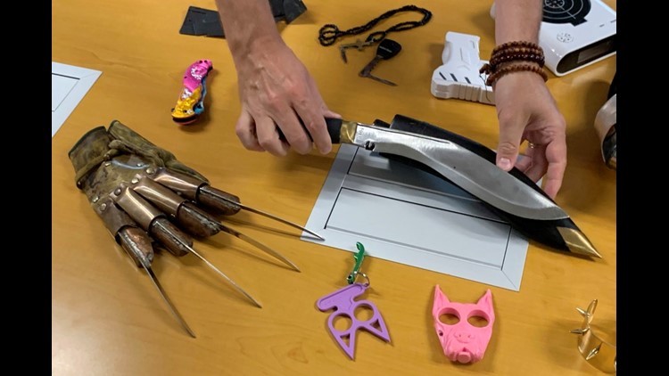A person is holding a silver knife with a black handle, standing over a table with various items including a pair of scissors, a pink and yellow toy, a pair of gloves, and a small pink figurine. | Checkpoint finds range from your run-of-the-mill large knives to some more\xe2\x80\xa6 unusual items. Photo by Zach Honig / The Points Guy. | 050b3c35eba7267d5e7f26b3948e7cabe6c9bcc09d7e9ec1c704a0ef0de4090c | 000000023104 | 0 | 0 | 37 | 21 | 0 | 0 | |