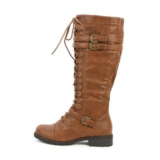 A pair of brown leather boots with a lace-up front, metal buckles, and a stacked heel. The boots have a rugged design with visible stitching and a ribbed texture on the upper part. | Wild Diva Timberly-65 Women's Fashion Lace Up Buckle Knee High Combat Boots | 13b15ac197cea97afd9ee63be06c1fd6b4ce02c0e219bd81293e2dfb29f3c578 | 000000023002 | 0 | 0 | 33 | 12 | 0 | 0 | |