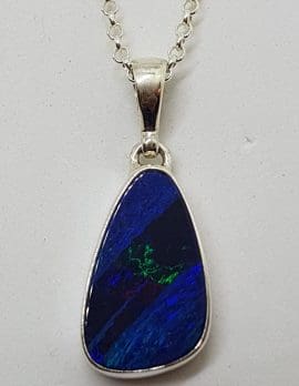 A silver pendant with a blue and green iridescent stone is displayed against a white background. | Sterling Silver Blue Opal Pendant on Silver Chain | 72068bbbf378b083a0bb12e4f31e2f97cedd87c1c41ee16182c76e701b978d4c | 000000023358 | 0 | 0 | 16 | 8 | 0 | 0 | |