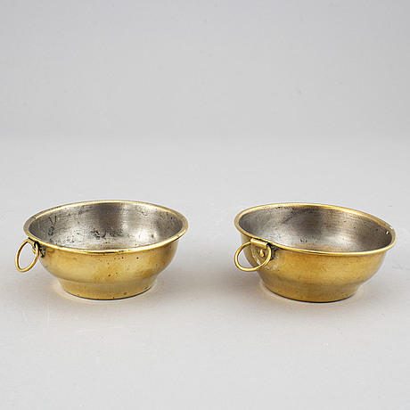 Two antique brass cups with a patina finish are placed side by side on a white background. | A pair of brass candelabra for two candles "blekingestakar and a pair of brass cups, 1800/1900. | 18789e99e2293dc22d18aa80a00316a32f52f3e25680ecbeabd710c88d39cd3f | 000000022999 | 0 | 0 | 17 | 16 | 0 | 0 | |