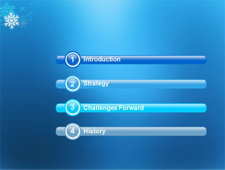 The second image shows a presentation slide with a blue background and a white snowflake design in the upper left corner. The slide has four sections with headings: 'Introduction', 'Strategy', 'Challenges Forward', and 'History'. Each section has a corresponding number and a blue circle with a white number inside it. The text is in a bold font, and the slide appears to be part of a business or educational presentation. | Snowflake Theme PowerPoint Template, Slide 3, 04167, Holiday/Special Occasion \xe2\x80\x94 PoweredTemplate.com | 3a3a1acf927e98e9d32d82abec365f33a5c6ee42548b9fcf19922a25548c23c9 | 000000023633 | 0 | 0 | 70 | 11 | 0 | 0 | |