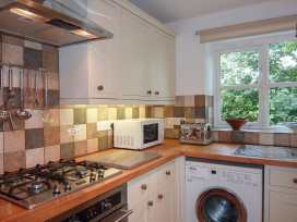 A modern kitchen with white cabinetry and tiled backsplash. The kitchen features a stainless steel stove with a wooden countertop, a white microwave, and a toaster. There is a window with a view of greenery outside. The kitchen also has a washing machine and a dryer. | Chapel Cottage - Cornwall - 976510 - thumbnail photo 7 | c1e697ead6b24dda4fdf7b23e816a32e1495c07b1c6e52ed7d1551297061890b | 000000023582 | 0 | 0 | 46 | 10 | 0 | 0 | |