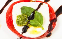 A close-up image of a slice of red bell pepper with a dollop of pesto on top, surrounded by a drizzle of olive oil and balsamic glaze. The pepper is cut into a circular shape, and there is a green leaf partially visible on the left side. The image is in portrait orientation. | mozzarella and tomato slices with basil close up | 62018cc7221c91f6fb3f691499fc51b7601ad9d74c27fc6974eb60cf7007bc56 | 000000023516 | 0 | 0 | 53 | 8 | 0 | 0 | |