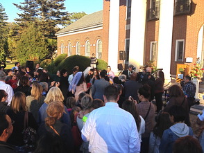 A large crowd of people is gathered outside a church, with some individuals taking photos and others watching. The church has a red brick facade with a white trim around the windows and a large arched window above the entrance. The sky is clear and blue. | Mayor DeLuca Performs Mass Wedding on Steps of Municipal Building, photo 4 | 0d6237e416420246c2094386612cc5d61e353497221af1c689e15ba45ed995a1 | 000000023569 | 0 | 0 | 46 | 12 | 0 | 0 | |