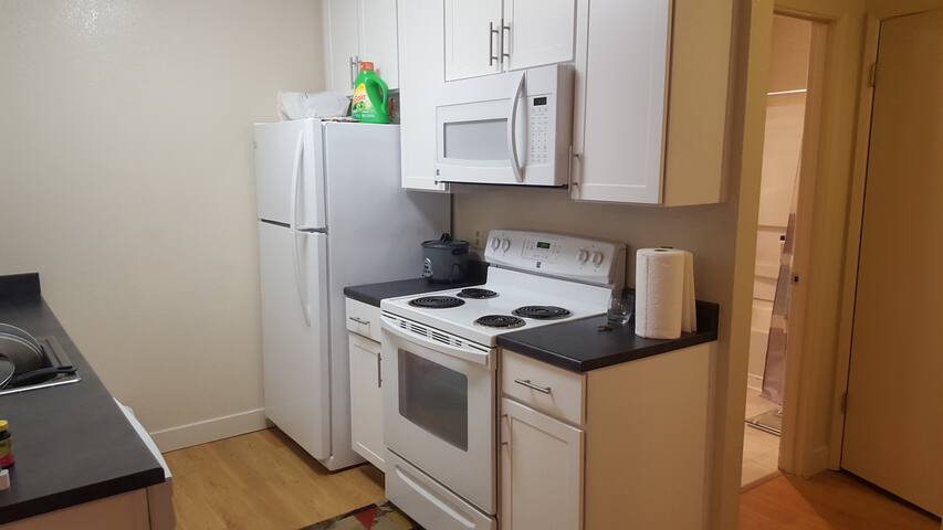 A small kitchen with white appliances, including a refrigerator, microwave, and stove. There is a sink with a dish rack and a bottle of dish soap. The countertops are black, and there are paper towels and a coffee maker on the counter. The floor is wooden, and there is a rug partially under the stove. | 1bed 1bath apt availbl in UnionCity - Union City - Huoneisto | 7af1f3783e20da98d6b1d4fe0a8a26ce2ac8148adc102caf6192c2ddcc9c80d2 | 000000024373 | 0 | 0 | 55 | 11 | 0 | 0 | |