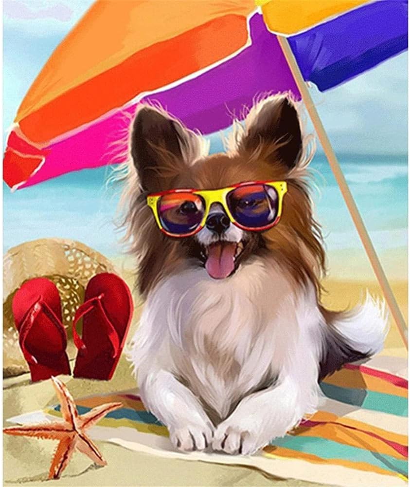 A small brown and white dog with a tongue out is sitting on a colorful striped beach towel. The dog is wearing a pair of yellow sunglasses with blue lenses. Behind the dog, there is a large, colorful beach umbrella with shades of pink, orange, yellow, and blue. To the left of the dog, there is a pair of red flip-flops with gold embellishments, and to the right, there is a starfish on the sand. The beach setting includes a clear blue sky and calm sea in the background. | 5D Diamond Painting Max 62% OFF Beach Dog DIY Adults Kit Kid 2021 spring and summer new Art for | e347059bc32bb1121e6333baae39ef0155005f78dba32141741009de577bf0ed | 000000024357 | 0 | 0 | 89 | 19 | 0 | 0 | |