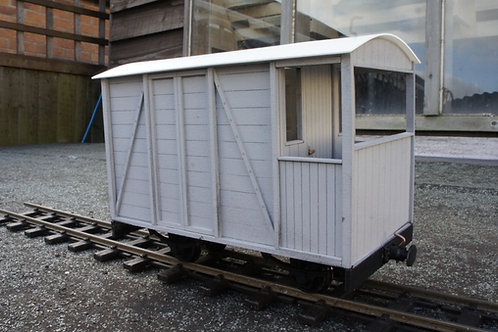 A small, white, wooden shed with a sloped roof and a single window is placed on a set of train tracks. The shed has a door on the right side and is surrounded by a gravel area. | Lasercut IP 27 Guards Van Kit | 56eed02df94aaeffd2738c66d112eabc659515bb851e75f2d6c5eabd4c45367f | 000000024389 | 0 | 0 | 37 | 6 | 0 | 0 | |