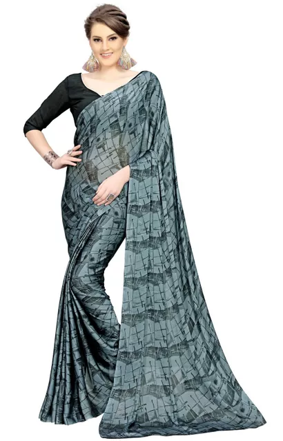 A woman is wearing a long, flowing grey saree with a detailed pattern that resembles a stack of money. The saree has a dark grey border and is draped elegantly over her body. She is accessorized with large, dangling earrings and is posing with one hand on her hip. | Black Color Imported Chiffon Printed Design Saree | 9014319a7017a4d29392b4a6570353d8034713ef171468d17923e9eb24583868 | 000000024503 | 0 | 0 | 49 | 7 | 0 | 0 | |