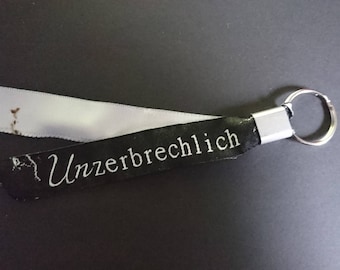 A black and white keychain with the word 'UNZERBRECHLICH' written in cursive on a black strap, attached to a silver key ring. The keychain is lying on a dark surface. | Unbreakable key chain | 667d525a9d415de9aaa54a327dacf95db59b12106175f59ee7af9675dfe7c510 | 000000024512 | 0 | 0 | 30 | 3 | 0 | 0 | |