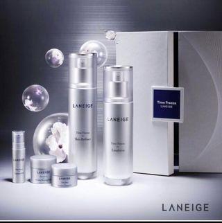 A luxurious skincare set from LANEIGE is displayed on a white background. The set includes a large silver bottle with a pump dispenser, a smaller silver bottle with a pump dispenser, a silver jar with a lid, a silver tube, and a small silver container. There are also two round, iridescent soap bubbles floating in the air, and a delicate white flower with petals. The packaging is white with a blue label featuring the brand name and logo. | \xf0\x9f\x9a\x9a Laneige time freeze toner and emulsion | e9e4bceccff6dd925615422413823a98553b242e96dbbd7066ed3ea5e27022eb | 000000024470 | 0 | 0 | 78 | 7 | 0 | 0 | |