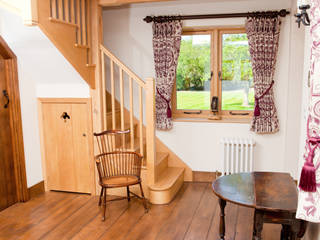 A classic wooden chair with a curved backrest and a round seat is placed on a wooden floor in a room with a wooden staircase, a wooden table, and a window with red and white patterned curtains. | Barn Conversion Design by Deborah Ltd Couloir, entr\xc3\xa9e, escaliers classiques | ae27e2e8b5703dce286ef877323fa22672062fe70a0853d8ddbbd4a48fef3c95 | 000000024591 | 0 | 0 | 37 | 10 | 0 | 0 | |
