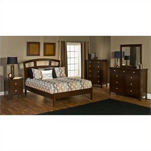A bedroom with a wooden bed frame and a patterned bedspread. The room has a wooden floor, a black and white rug, and a wooden nightstand with a lamp and a book on it. There is a wooden dresser with a mirror on top and a lamp beside it. The walls are painted in a light color, and there are two framed pictures on the wall. A window with curtains is visible, and the room is well-lit. | Hillsdale Metro 4 Piece Bedroom Set with Riva Platform Bed | 62c063e961bd32bd69f78d1de1751a4c815e8626feedb49c1144cfcea579ef1c | 000000024604 | 0 | 0 | 77 | 10 | 0 | 0 | |