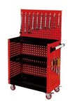 A red toolbox with black handles and a black lid is open, revealing multiple compartments with red and black pegboards. The pegboards have various tools hanging on them, including screwdrivers, wrenches, and pliers. The toolbox has wheels on the bottom, allowing it to be easily moved. | Tool Box Trolley | ef334c0872bcc36222feb2f266f9f2f8b2cf6483fb712a50d33fb4bad2359e23 | 000000024646 | 0 | 0 | 46 | 3 | 0 | 0 | |