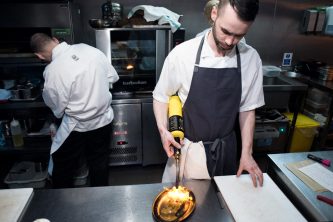 A chef is standing in a kitchen, holding a blowtorch to a piece of food on a cutting board. The chef is wearing a white shirt, a black apron, and has a beard. There is another chef in the background, also wearing a white shirt and an apron, working at a counter. The kitchen has various appliances and utensils, including a microwave, a coffee maker, and a sink. There are also bottles and bowls on the counter. | wastED pop-up restaurant by Dan Barber on rooftop of Selfridges, London, using food waste | 7766d436eda257a82ee92d1b44915ed1fd84a47edf8303ba8e1ca299e08432e5 | 000000024592 | 0 | 0 | 77 | 14 | 0 | 0 | |
