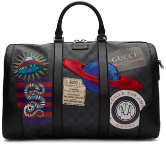 A black leather Gucci bag with a variety of patches and stickers, including a red and blue striped patch, a red and blue circular patch, a blue and white circular patch, a red and blue star patch, a red and blue planet patch, a red and blue rocket patch, a red and blue bicycle patch, a red and blue heart patch, a red a... | Gucci Black Soft GG Supreme Carry-On Duffle Bag | 29aa13f60c8e7b0aa8330895f1f1b33821f20670a453b4487a8568b2a2f0c071 | 000000025073 | 0 | 0 | 110 | 8 | 0 | 0 | |