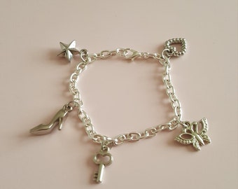 A silver bracelet with a star-shaped charm, a heart-shaped charm, a key charm, and a high heel shoe charm is displayed against a pink background. | charm bracelet for child | 5bbc99a77835eec74a2af362d47fa417652bbfa632049fef13a5adda44a8a37c | 000000025079 | 0 | 0 | 25 | 4 | 0 | 0 | |