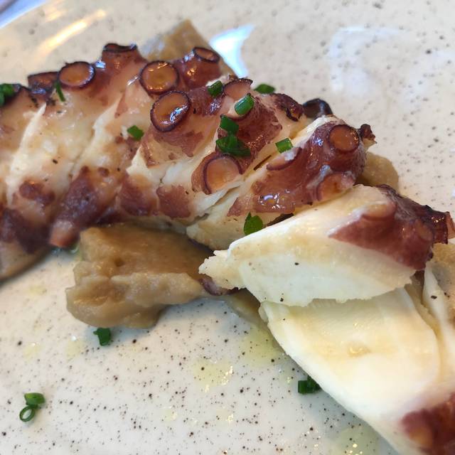 A close-up of a dish with a piece of octopus on top, surrounded by a sauce and garnished with chopped green herbs. The octopus has a tender texture and is sliced into thin pieces. The dish is served on a white plate with a speckled pattern, and there are small green herbs scattered around the plate. | Octopus - TapaVino Lincoln Plaza, London | f14eb687adfc8981c651519d7621c2929f846c60db720aa651ef298722cb36b7 | 000000024905 | 0 | 0 | 56 | 6 | 0 | 0 | |