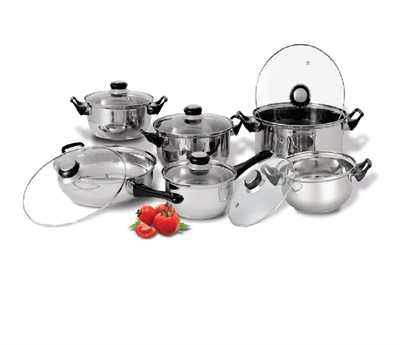 A collection of stainless steel pots and pans is displayed on a white background. The set includes a variety of sizes and shapes, such as a large pot with a lid, a smaller pot with a lid, a frying pan, and a saucepan. There are also two glass lids, one of which is placed on top of a pot. In the foreground, there are th... | 12 Piece Stainless Steel Cookware Set CS20159 | 3dacd02b8e5d322071ee4888c7c0457a5394e50d9e761dc612aa13796488479e | 000000024983 | 0 | 0 | 71 | 7 | 0 | 0 | |