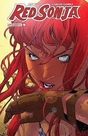 The first page of a comic book titled 'Redsonja' with a female character with red hair and green eyes. She is wearing a brown leather glove and is in a dynamic pose with her hair flowing. The background is a warm yellow tone, and there is text at the top of the page that reads 'AMY REEDER' and 'CARLOS GOMEZ'. | Red Sonja Vol. 4 #10 | 37cc88f634e56db6c4c60aa04d81f62260825f983fb4bb63bf41adf6fcc8280e | 000000025118 | 0 | 0 | 60 | 5 | 0 | 0 | |