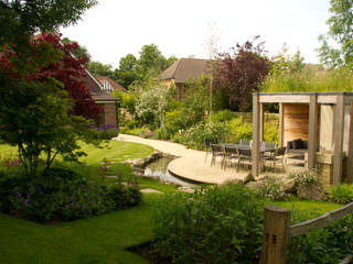 A serene backyard scene with a variety of plants and trees. There is a wooden gazebo with a thatched roof, surrounded by lush greenery. A stone pathway leads to the gazebo, flanked by neatly trimmed grass and vibrant flowers. A small pond is visible near the gazebo, and a wooden fence runs along the edge of the propert... | Contemporary Surrey Garden with Outdoor Kitchen.: Garden by Elks-Smith Landscape and Garden Design | 778d5068f04a40186641a1596824be1a5627f8ce3cefae9c81ead27637e189a9 | 000000024716 | 0 | 0 | 58 | 13 | 0 | 0 | |