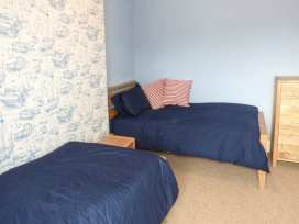 A small, neatly made bed with blue bedding is situated in a room with blue walls and a patterned wallpaper. The bed has a wooden headboard and a single pillow with a red and white checkered pattern. There is a wooden nightstand with a drawer next to the bed, and a wooden dresser with a mirror is visible in the backgrou... | Sea View Apartment - North Wales - 924749 - thumbnail photo 13 | 6822616f7bd41596bbcddfe960f4b516c4190a599d72c3aa87f968fd93c02571 | 000000025158 | 0 | 0 | 61 | 12 | 0 | 0 | |