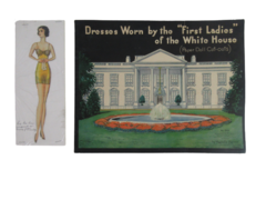 A vintage-style poster featuring a woman in a dress with the text 'DRESSES WORN BY THE FIRST LADIES OF THE WHITE HOUSE' at the top. The poster includes an illustration of the White House with a fountain in the foreground and trees on either side. The poster is framed with a decorative border and has a vintage feel. | Maybelle Mercer Dresses Worn By First Ladies of White House Paper Dolls 1937 | 3d8f20d9eb5c9f92dcb33c3391f41299411011383ba2939bd47b2d1959f0ef0a | 000000026848 | 0 | 0 | 58 | 13 | 0 | 0 | |