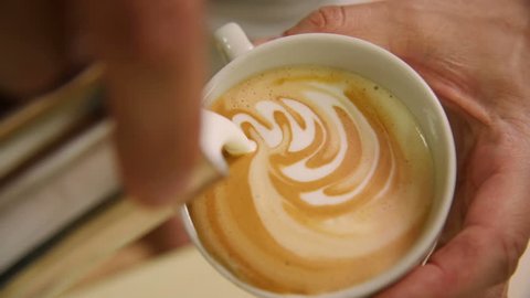 A person's hand is pouring milk into a white cup, creating a heart-shaped latte art design on the surface of the coffee. The cup is placed on a surface, and the person's hand is holding a spoon with a dollop of milk on it. The background is blurred, focusing the attention on the cup and the latte art. | Making of cafe latte art, heart shape | 6800fd76990a75f0fbcc65e878ff6a6dc9182a0ff511ae9c5d2ed9769e9876ef | 000000027349 | 0 | 0 | 58 | 7 | 0 | 0 | |