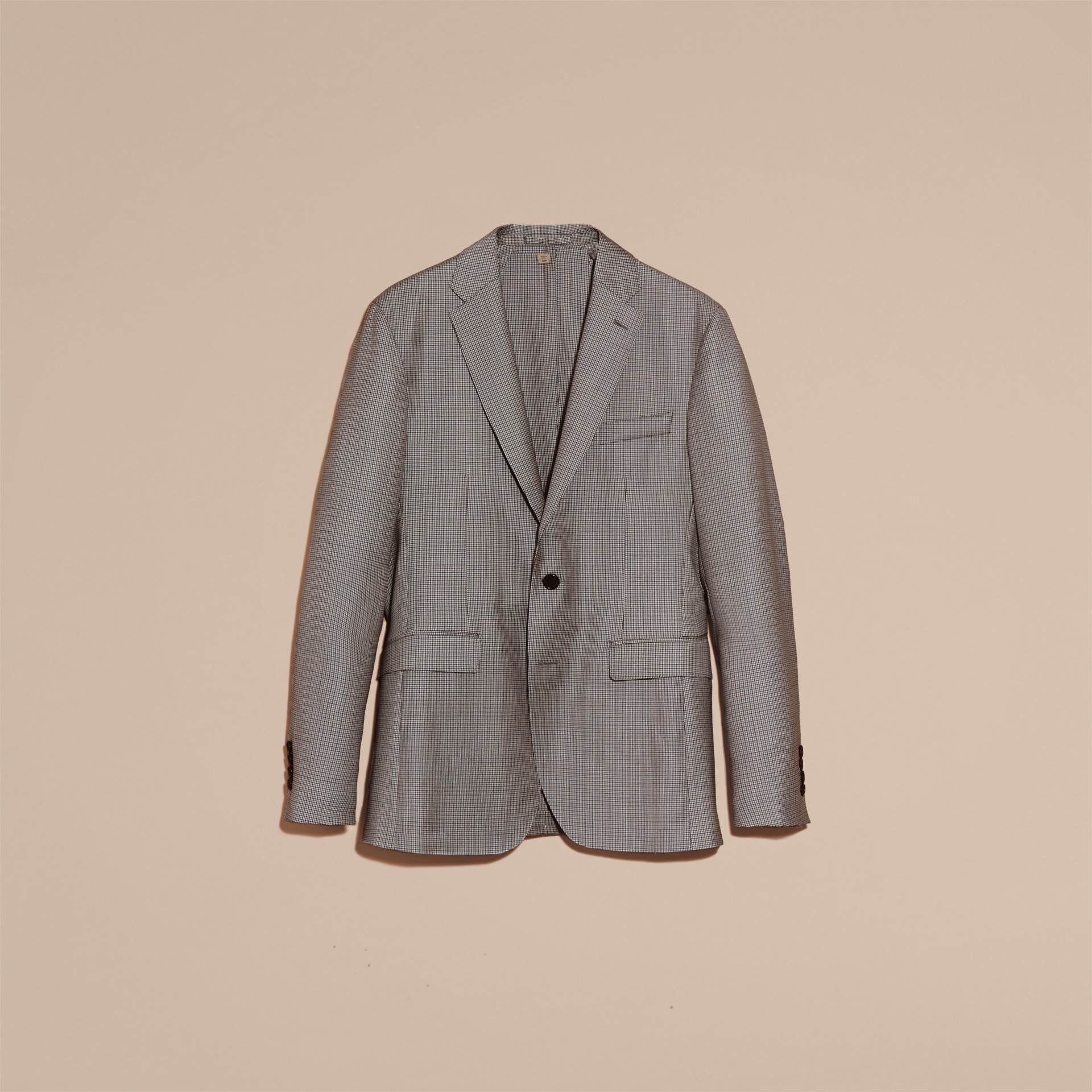A plain grey blazer with a button and a small patch pocket on the left side is displayed against a peach-colored background. | Slim Fit Houndstooth Wool Tailored Jacket - Men | Burberry Australia - gallery image 4 | 3c3d8aa900bb9ca20b836c4e693a9cbbeee5518f5b13cdf44a7eaf28b08557b3 | 000000027311 | 0 | 0 | 22 | 15 | 0 | 0 | |