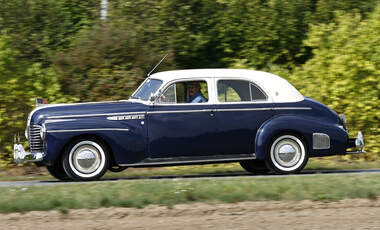 A blue vintage car with a white roof is parked on the side of a road. The car has a classic design with round headlights, a chrome grille, and a prominent front bumper. The rear features a spare tire mounted on the trunk. The car is positioned on a road with a grassy area beside it, and there are trees in the backgroun... | Buick Series 50 Super, 4-Door Sedan, Baujahr 1941 | 5cafccc6679bd984861823713c069d5ca510afcdd977ecc50909a05f6da5ec4d | 000000027210 | 0 | 0 | 63 | 8 | 0 | 0 | |