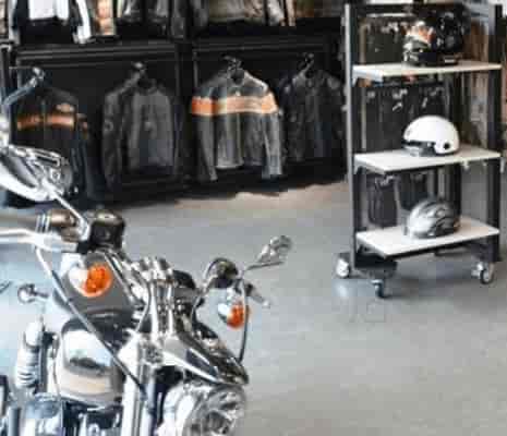 A motorcycle is parked in a showroom with various clothing items displayed on racks in the background. The motorcycle is positioned on the left side of the image, with its front wheel visible and the seat facing the viewer. The showroom has a modern design with a clean, white floor and a black ceiling. The clothing ite... | harley davidson corporate office. Product View - Harley Davidson Motor Company India Pvt Ltd (Corporate Office) Photos, Corporate Office | 7594c8e40e263a66167e3a79d97447877b3699a93a354267887a1b7bb5573a5b | 000000027915 | 0 | 0 | 89 | 19 | 0 | 0 | |