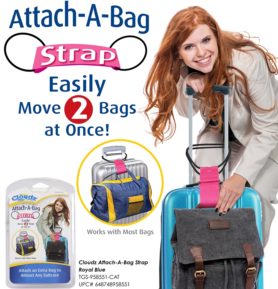 The second image is a promotional advertisement for 'Attach-a-Bag' products. It features a smiling woman with red hair, wearing a white jacket, holding a blue suitcase with a grey attach-a-bag attached to it. The advertisement includes a tagline 'Move 2 bags at once!' and emphasizes the ease of use of the product. The ... | Cloudz Attach-A-Bag Strap_edited | 9542997a6971790fea1cb7e58fa9470e2dac95f5879a2e6c8152090ace489b56 | 000000027967 | 0 | 0 | 66 | 3 | 0 | 0 | |