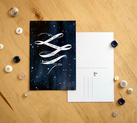 A blue card with a white ribbon design and a handwritten message is placed on a wooden surface. The card is accompanied by a white envelope with a handwritten address and a blue stamp. Scattered around the card and envelope are various buttons and a few loose threads. | we are made out of stars -- single (1 pc) postcard | 7cc3b36eb0f1fc8ac6d68d31a87235f7fb12b72a78a9ba5d3d4ec1707678c0f2 | 000000028298 | 0 | 0 | 48 | 11 | 0 | 0 | |