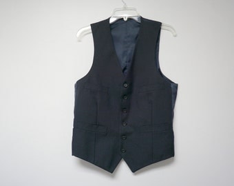 A black vest with a white shirt underneath is displayed on a white hanger against a white background. | NEW w/o TAG!!! dark gray pinstripe men's vest . 38" bust | 25054e551fed4ab66397397a1d92797926a2e6d89b3f84579b84229be597373b | 000000028456 | 0 | 0 | 18 | 11 | 0 | 0 | |