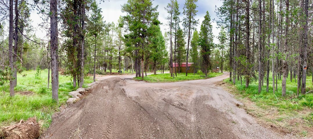 A dirt road surrounded by tall trees and lush greenery. The road splits into two paths, one leading to a red building in the distance. The sky is partly cloudy, and the overall atmosphere is serene and natural. | Private 0.5 acre RV lot with Full Hook Up Near YNP | 14d088999e12fc6ad4ed323de0596f924e9e83dc9e4a870fa20fcebd1cbc7882 | 000000029010 | 0 | 0 | 38 | 11 | 0 | 0 |