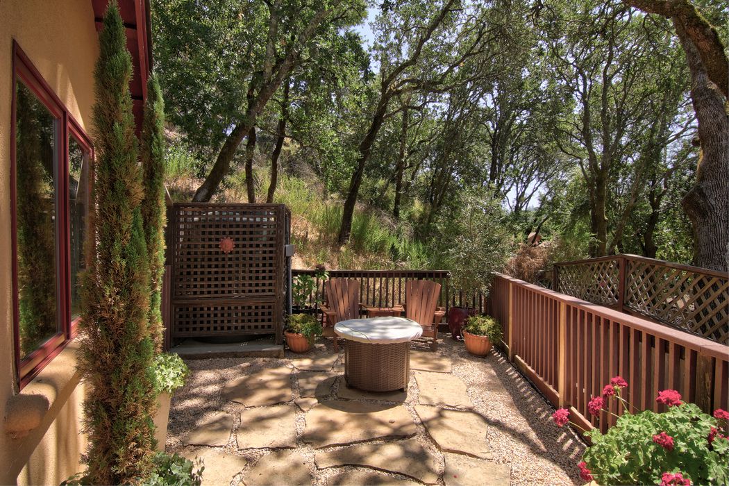 A serene backyard patio with a round table and two chairs, surrounded by lush greenery and a stone pathway. The patio is enclosed by a wooden fence, and the scene is bathed in warm sunlight filtering through the trees. | 4611 Warm Springs Rd Glen Ellen, CA 95442 | 65b2fe7ee1dab131c622ec3085ec8e90ca529da2300ae667f33fda858f625426 | 000000028943 | 0 | 0 | 39 | 8 | 0 | 0 | |