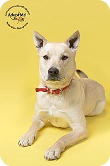 A tan dog with a red collar is lying down on a yellow surface. The dog has a calm expression and is looking directly at the camera. The background is a plain yellow color, and there is a logo in the top left corner that reads 'ADOPT ME'. | Shepherd (Unknown Type) Mix Dog for adoption in Sauk Rapids, Minnesota - Dino | 2d94878a0fb8f078fc7f81dccddd7af6ccae9deb9e6afdc6ebcdc4946eb78032 | 000000029029 | 0 | 0 | 48 | 13 | 0 | 0 | |