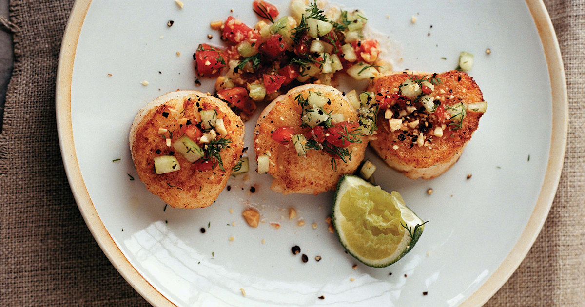 A plate of food with three pieces of meat, possibly fish, topped with a variety of ingredients including diced tomatoes, cucumber, and herbs. There are also two lime wedges on the side of the plate. The plate is on a surface with a beige cloth underneath, and there are some crumbs and black specks scattered around the ... | Padma Lakshmi adds crushed peanuts to buttery scallops for a little crunch | 8a26ba2339bd89464c70c9d1619e231ff0227d90a92acce9547b6e5128ccddc1 | 000000028930 | 0 | 0 | 58 | 12 | 0 | 0 | |