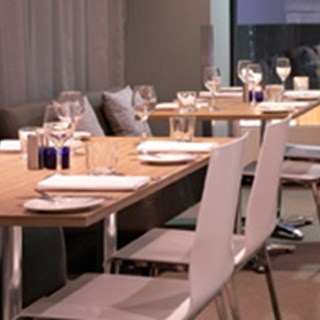 A modern dining area with a long wooden table set with white plates, silverware, and blue napkin holders. The table is surrounded by white chairs with metal legs. On the table, there are also wine glasses, water glasses, and a small blue container. The room has a gray curtain and a large window in the background. | The Louden Kitchen & Grill - Melbourne | bc4281c85f29b23392986fd059f65d8f4dc1a19960b1172269544258f6774ad7 | 000000028952 | 0 | 0 | 56 | 7 | 0 | 0 | |