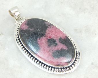 A silver pendant with a pink and black marbled stone is displayed against a white marble background. | Large Rhodonite Sterling Silver Oval Pendant 3Q6FC5 | 28d7fcdb0eb7035de6277b66e274b27923d317ef5dac1f7b3bf389f5f564a286 | 000000029107 | 0 | 0 | 17 | 7 | 0 | 0 | |