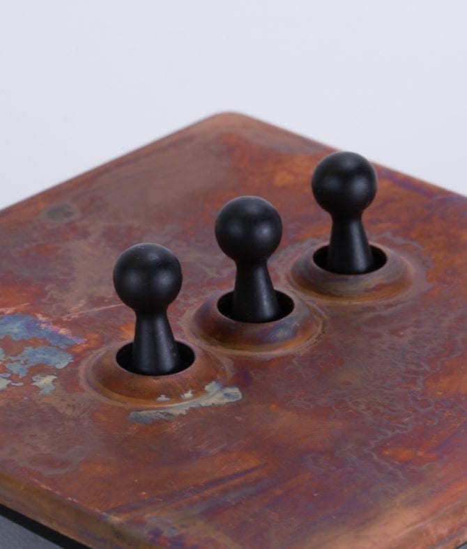 A close-up of a rusty, aged arcade game controller with three black buttons and two black joysticks. The controller has a brownish color with visible rust spots and wear marks. The buttons and joysticks appear to be in good condition despite the controller's age. | copper backplate with triple black toggle detail on white background | a05a14b37ed180e5d479efb9a67ce0e4ed4cf17fef16448afd6334a4d7c8421c | 000000028292 | 0 | 0 | 44 | 10 | 0 | 0 | |