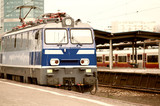 A vintage blue and white train with a red stripe is parked at a station. The train has a distinctive front design with a large headlight and a small window. The station has a covered platform with a red and white train visible in the background. The sky is overcast, and the overall image has a sepia tone, giving it an ... | locomotive, the train | 31ba70e2d38f63cd8eae0295e5094e66053c6932431b01358bf8d6c89a74ff70 | 000000029684 | 0 | 0 | 63 | 3 | 0 | 0 | |