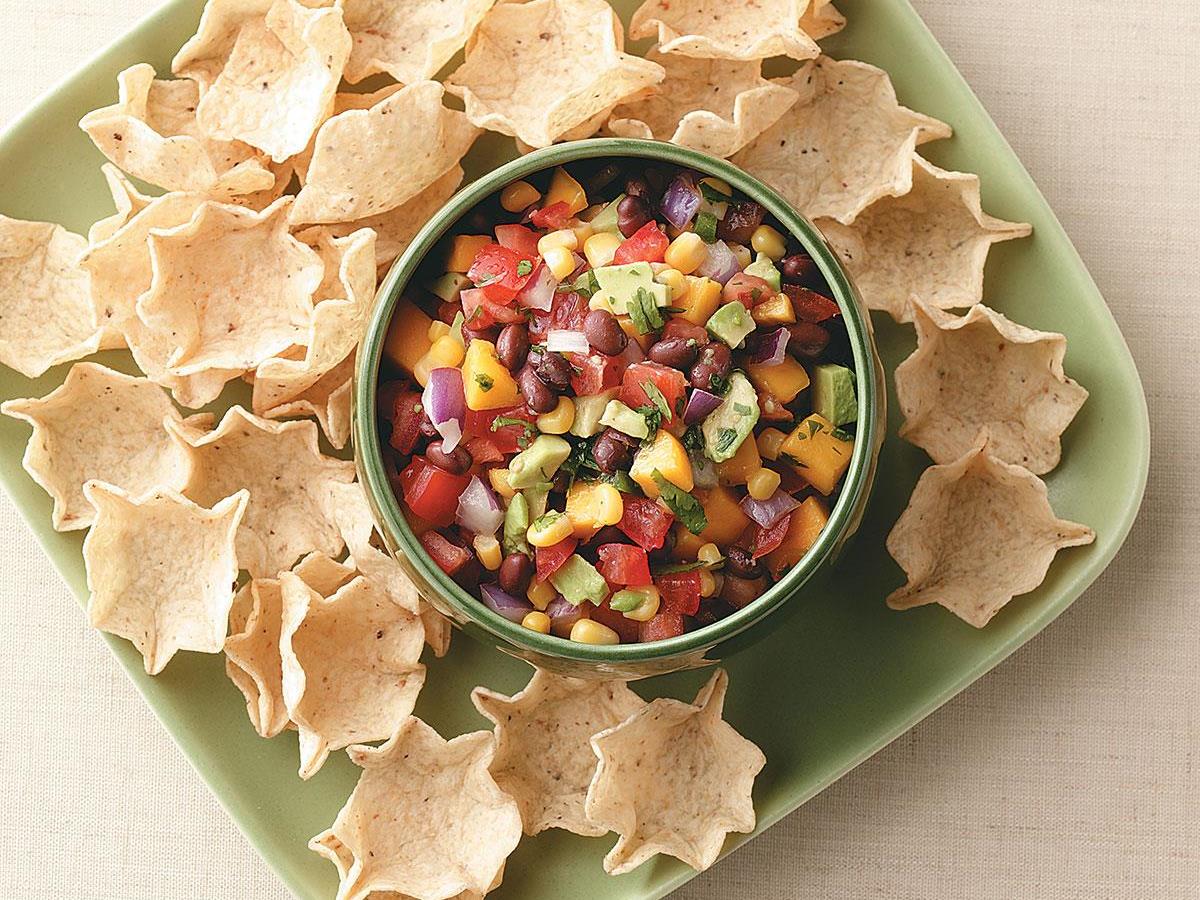 A bowl of salsa with a variety of ingredients such as tomatoes, onions, and corn is placed on a green plate. Surrounding the bowl are several tortilla chips, some of which are star-shaped. The plate is on a surface with a beige background. | Fresh Summer Salsa | 33f696e40c9dd310e3895934652b54c3f85ef598820a9bb5fe31e10df47a21c6 | 000000029754 | 0 | 0 | 43 | 3 | 0 | 0 | |