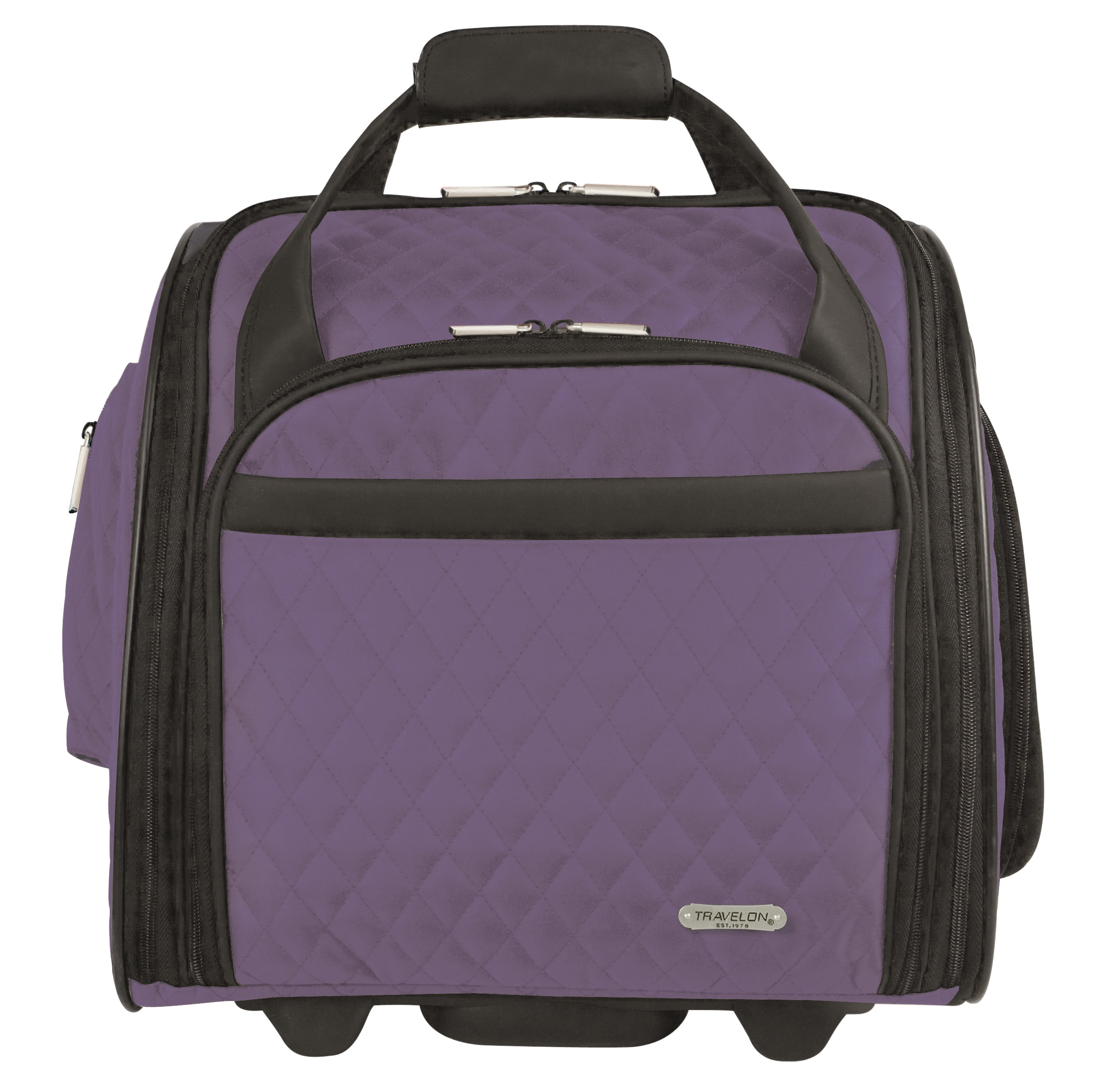 A purple fabric laptop bag with a quilted texture and a black trim is displayed against a white background. The bag has a front pocket with a zipper closure, a handle on top, and a black strap with a silver buckle. The interior is visible, showing a black lining with a laptop compartment and a smaller pocket. The bag h... | Canvas tote bags on wheels - Travelon Wheeled Underseat Carry On With Back Up Bag | eec2afe19f1d5cde14535507bd52acdd0dbf75bc65f7b58ecd0876f09b6361d2 | 000000029681 | 0 | 0 | 69 | 15 | 0 | 0 | |