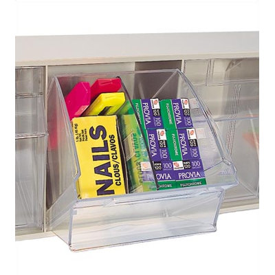 A clear plastic storage container filled with various office supplies, including a yellow box of nails, a green box of pens, a purple box of markers, and a green box of paper clips. The container is placed on a white surface against a white background. | Quantum Storage Divider for 4 Compartment Clear Tip Out Bin | 31942277958d7d0509909f746d61ad276b5ef38c3457730a0bbf7046913aa97f | 000000029746 | 0 | 0 | 45 | 10 | 0 | 0 | |