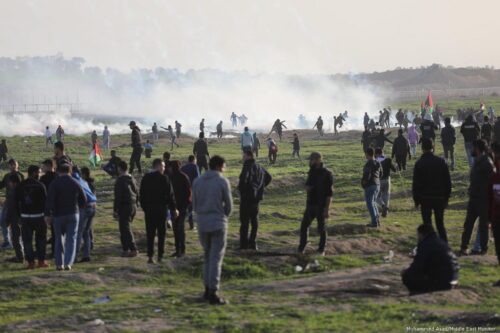 A group of people is gathered in a field with a large plume of smoke in the background. The smoke appears to be coming from a fire or an explosion, and it is billowing into the sky. The people are standing at a distance from the smoke, and some are wearing backpacks. The field is covered with grass, and there are no vi... | Israeli forces fire at Palestinians as they protest during the Great March of Return along the Gaza-Israel border on 25 January 2019 [Mohammed Asad/Middle East Monitor] | 123384bccb4e3919ab682bd866679b54a184738ead13264decb65c95430479e4 | 000000029721 | 0 | 0 | 68 | 26 | 0 | 0 | |