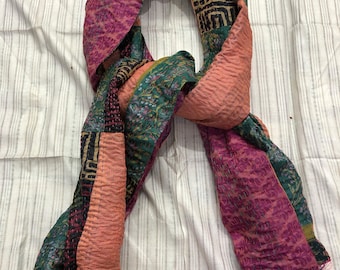 A colorful scarf with a mix of pink, green, and orange patterns is draped over a white bedspread with a striped pattern. | Beautiful Indian Silk Handmade Kantha ScarfShawlWrap Stitched Embroidered Reversible Scarf Hand Quilted Women Bandanas headband | 68f37b94419111e0a3080b10eaba8ff567f8bbff81198ed7c2e8e42e1f9e52c1 | 000000030003 | 0 | 0 | 22 | 15 | 0 | 0 | |