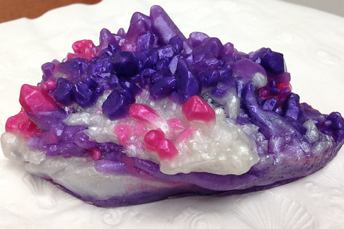 A purple and pink crystal formation with a smooth, glossy surface is displayed on a white paper with a floral pattern. The crystal has a variety of shapes, including pointed and rounded, and is set against a plain background. | Gemstone Soap Scented in Fairy Dust | d9d293a374df904204e72d00641bebec124db86af16c79ec0958b849996ab730 | 000000030056 | 0 | 0 | 39 | 6 | 0 | 0 | |
